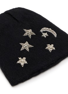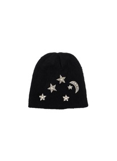 This Jennifer Behr beanie is a stunning blend of cozy warmth and sparkling charm. Crafted from luxurious black wool, it provides essential warmth for chilly days while maintaining a chic aesthetic. The beanie is adorned with glittering star and crescent moon motifs, encrusted with shimmering crystals that catch the light beautifully. This celestial-inspired design not only keeps you warm but also adds a touch of glamour to your winter wardrobe, making it perfect for those who love to combine functionality with standout style.
