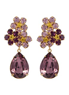Introducing the Lauretta Earrings, handcrafted in New York, these earrings feature pear-shaped Austrian crystal drops delicately suspended from a blossoming cluster of flowers, creating a lush garden effect. Set in an 18k gold-plated frame, the Lauretta Earrings are poised to become a treasured heirloom.