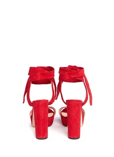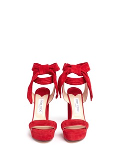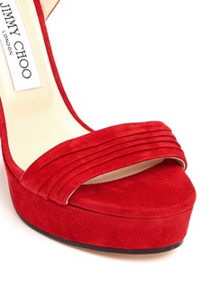 此款Jimmy Choo的高跟凉鞋尽展您甜美高贵的气质,选用亮眼的红色绒面皮烘托出大气格调,搭带上呈现细致的褶皱纹理,延长的后绊带可绑成蝴蝶结,增添浪漫气息,搭配粗跟设计,让您步行更轻松自然。