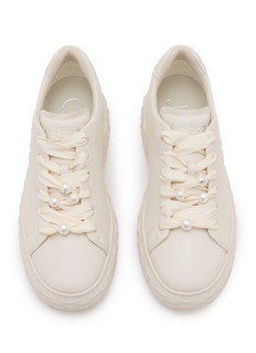 Elevate your footwear collection with these Jimmy Choo sneakers, crafted in sumptuous cream leather. These sneakers strike a perfect balance between elegance and playfulness, featuring unique pearl detailing on the laces and a glitter-encrusted heel for a subtle sparkle. The quilted sole not only adds a layer of comfort but also enhances the shoe's luxurious appeal.