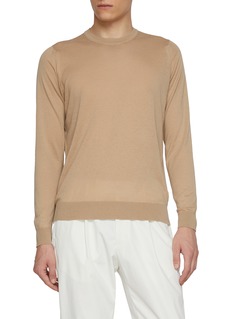 This John Smedley sweater channels understated luxury through its soft blend of cashmere and cotton. With a clean crew neckline and soft drape, it brings quiet sophistication to layered tailoring or pared-back separates—perfect for gallery strolls to Sunday brunch.