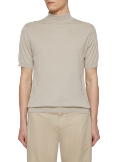 An ode to minimalist sophistication, this John Smedley knit top refines warm-weather dressing with a structured mock neck and sculptural drape. Its short sleeves and finely ribbed hem offer ease for layering or solo wear—ideal for gallery days or café interludes.
