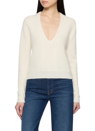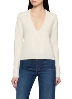 Stripped back yet sensuous in proportion, this sweater by Jovens highlights the softness of pure cashmere through a deep V-neckline and refined cable ribbing. Designed to skim the body, it pairs effortlessly with denim or tailored trousers for understated, everyday elegance.