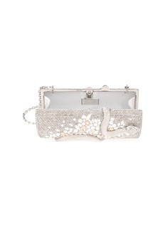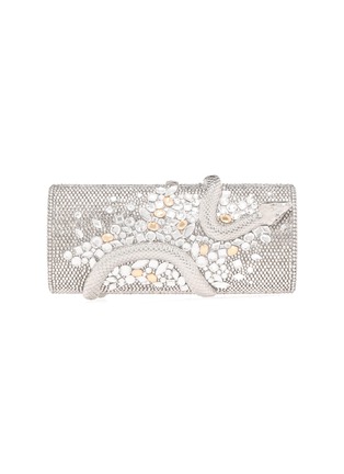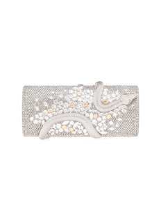 Striking and seductive, the Spiral Snake Hypnotic clutch is a bold expression of glamour with an edge. This cylinder-shaped handbag is fully embellished in silver crystals, featuring a captivating pattern of clustered stones in navette, square, diamond, and teardrop shapes that create texture and radiance from every angle.