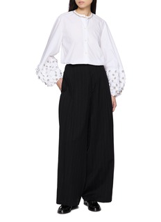 A crisp cotton shirt reimagined with sculptural romance, the Chester style is defined by its tiered sleeves—each pleated layer adorned with Jupe by Jackie’s hand-embroidered floral motifs. A delicately stitched neckline adds balance, creating a statement piece that elevates wide-leg tailoring or soft skirts with artisanal flair.