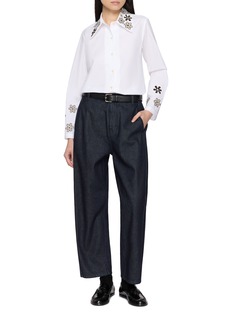 A crisp cotton poplin shirt transformed through Jupe by Jackie’s expressive hand embroidery, the Dempster style features bold floral motifs blooming across its wide point collar and sleeves. The contrast stitching adds graphic clarity to its clean silhouette, making it a standout piece for elevating denim or tailored separates.