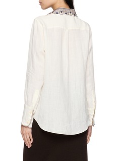 Crafted from pure linen, this shirt spotlights Jupe by Jackie’s signature artistry through an intricately hand-embroidered statement collar—an ornamental flourish that elevates its otherwise pared-back silhouette. Lightweight and easy to style, it shifts effortlessly from weekday tailoring to refined weekend dressing.
