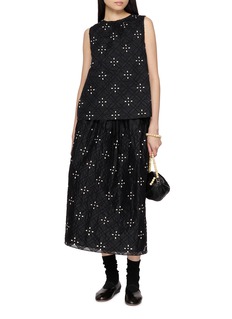 Crafted from ethereal Swiss cotton organdie, this sleeveless top showcases Jupe by Jackie’s signature hand embroidery—each floral motif stitched with poetic precision. Light yet sculptural, it brings a quiet statement to summer tailoring or voluminous skirts.