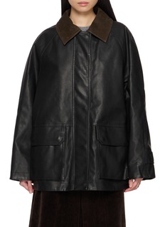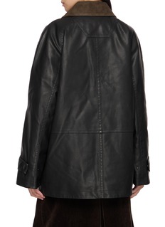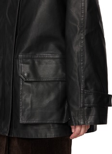 Juun.J 受到青年和街头文化的启发,以新式街头美学冲击传统剪裁。这款夹克采用质感仿皮革面料,撞色翻领设计融入秋冬质感一笔,翻盖大口袋设计方便日常出街。