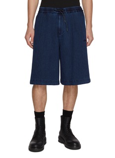 Juun.J refines utilitarian ease through texture and proportion. Cut from richly woven dark-wash denim, these shorts feature a relaxed silhouette tempered by a drawstring waist, pairing effortlessly with oversized tees or structured outerwear for directional summer layering.