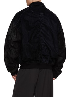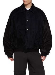 Juun.J 受到青年和街头文化的启发,以新式街头美学冲击传统剪裁。这款夹克融合天鹅绒质感丹宁与仿绒面皮袖身,带来材质拼接碰撞,展现品牌标志性的解构街头风格。