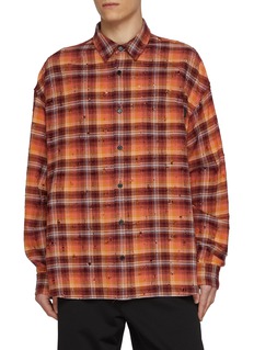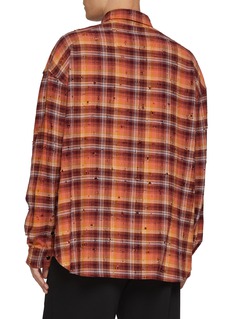 Washed in sun-faded tones, this long-sleeve shirt balances fragility and attitude through a distressed chequered pattern. The viscose-linen blend lends airy softness, making it ideal for layered city dressing or worn loose for artful, off-duty expression.