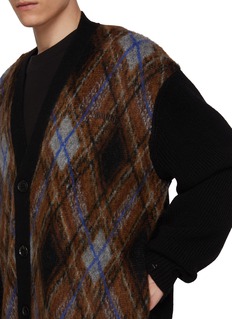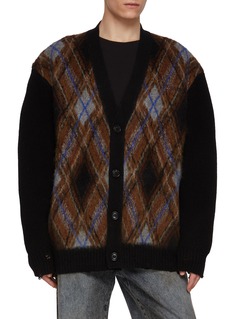 Juun.J 受到青年和街头文化的启发,以新式街头美学冲击传统剪裁。这款开衫采用柔软的混羊毛纱线织就,饰有经典菱格纹图案,搭配宽松廓形与落肩设计,营造出复古与街头融合的视觉风格。