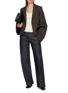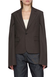 The bell sleeve blazer by JW Anderson redefines classic tailoring with its dramatic flared sleeves and structured silhouette. A perfect blend of sophistication and avant-garde style, it elevates any ensemble with bold, modern elegance. Ideal for making a statement.