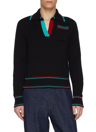 Tailored to a close, shrunken silhouette, this cotton cashmere polo sweater by JW Anderson redefines collegiate codes with graphic precision. Vibrant contrast trims frame the open placket and hem, punctuating the deep black knit. Style it with relaxed denim to sharpen its refined proportions.