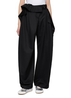 Reworking tailoring codes with sculptural intent, these trousers by JW Anderson reinterpret the classic fold-over waist through a fluid drape. Finished with an antique brass buckle and embroidered eyelets, they bring a subtle subversion to everyday dressing—best styled with a pared-back tee or a sharp shirt.