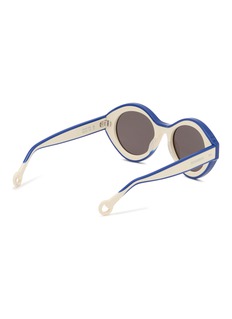 These Jwa07 sunglasses capture JW Anderson’s sculptural whimsy through a rounded “bumper” frame, layered in creamy white with electric-blue contouring. The bold profile and soft-tinted lenses deliver a retro-futurist finish—perfect for energising clean tailoring or elevating casual denim looks.