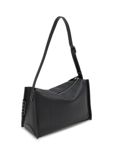 This J.W. Anderson shoulder bag exemplifies minimalist elegance with its sleek black leather and structured silhouette. The bag features distinctive silver-tone hardware accents along the strap, adding a modern touch to its classic design.