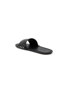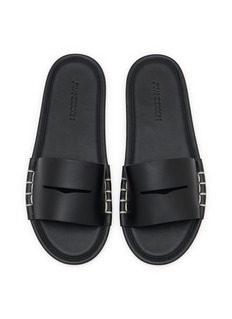 This sleek J.W. Anderson slide offers a sophisticated, minimalist design with its smooth black leather strap and distinctive silver-tone hardware details. Perfect for effortlessly elevating your casual summer wear, the slides feature a comfortable, molded footbed that promises all-day comfort.