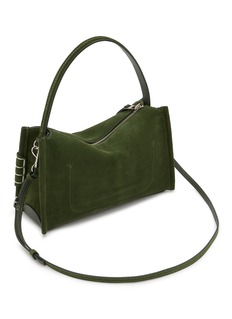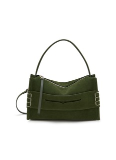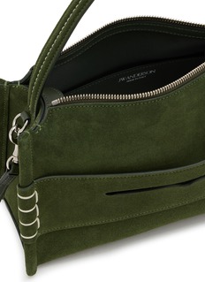 This J.W. Anderson shoulder bag is a statement in luxury and functionality, crafted in sumptuous olive green suede. The bag features a unique structural design with a zip top closure, complemented by understated silver-tone hardware on the straps that add a contemporary edge.