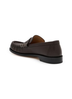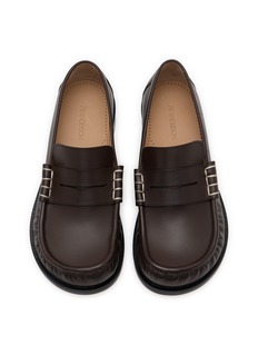 This J.W. Anderson loafer exemplifies classic sophistication with a modern twist, featuring a smooth dark brown leather upper and detailed with a distinctive silver-tone bar across the vamp. The meticulous stitching and ruched detail at the toe add a touch of artisanal craftsmanship.
