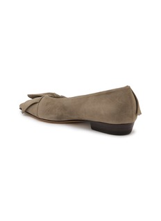 This J.W. Anderson flat presents an elegant interpretation of classic femininity with a contemporary twist. Crafted from supple suede in a neutral shade, the shoe features a unique ruched design that adds texture and visual interest. Its pointed toe and small heel provide a refined silhouette, making it versatile enough for both office wear and casual outings.