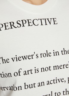 JW Anderson explores intellectual design through typographic artistry. This statement T-shirt features philosophical text about perspective and artistic engagement, whilst maintaining the label's signature blend of cultural commentary and wearable design. Conceptual fashion meets contemporary ease.
