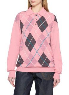 A playful twist on heritage knitwear, this bubblegum-hued polo merges Pringle’s iconic argyle pattern with JW Anderson’s bold colouration. Crafted from Scottish spun wool, its relaxed fit, rib trims, and horn buttons blend nostalgic charm with modern style.