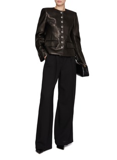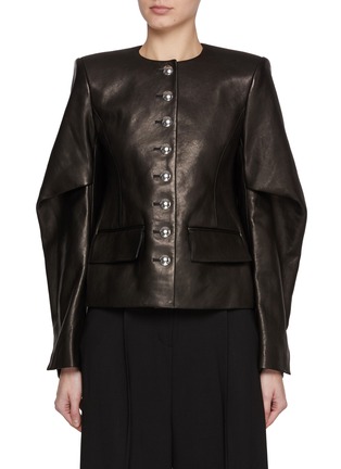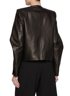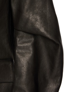 KHAITE 每件作品都呈现多元化元素,看似简单的基础色调与版型,巧妙展现硬朗与温和的结构对比。这款夹克采用硬挺光滑的皮革面料勾勒几何廓形,时尚兼具未来感。