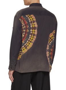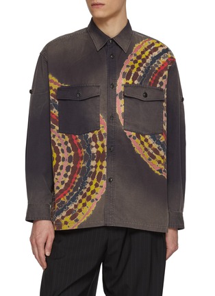 This long-sleeve shirt redefines utilitarian design with artisanal flair. Crafted from faded cotton, it features bold circular tie-dye motifs, creating a striking contrast against the muted, washed fabric. The button-front closure, chest flap pockets, and relaxed fit honor classic workwear codes, while the hand-dyed patterns infuse the piece with a bohemian, one-of-a-kind edge. A definitive statement piece, it seamlessly merges functional heritage with contemporary artistic expression.