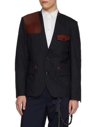 This lapelless blazer with patches redefines modern tailoring, blending sleek pinstripes with utilitarian accents. The asymmetric leather shoulder adds a touch of rugged sophistication, creating a versatile statement piece for contemporary wardrobes.