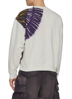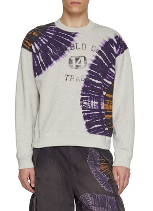 This crewneck sweatshirt from KHOKI redefines casual comfort with artisanal edge. Crafted from soft cotton, it features bold circular tie-dye motifs in deep purple and burnt orange, creating a striking contrast against the muted base. The distressed "MRT BLD CLB 14 TRACK" graphic adds a vintage athletic touch, infusing the piece with nostalgic character. Relaxed yet structured, it effortlessly anchors streetwear styling, making it a versatile staple for the modern wardrobe.