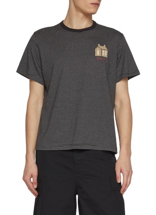 This short-sleeve striped tee from KHOKI reimagines everyday casualwear with nostalgic charm. Crafted from soft cotton jersey, it features a bold horizontal stripe pattern in warm colour, creating a retro-inspired visual rhythm. The embroidered house motif, paired with the word "School," adds a whimsical narrative touch, infusing the piece with playful character. Lightweight and breathable, it effortlessly anchors casual styling, making it a versatile staple for the modern wardrobe.