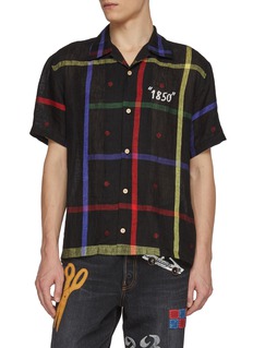 Crafted from lightweight linen, this short-sleeve shirt from KHOKI reimagines traditional Jamdani weaving with a contemporary twist. The vibrant multicolored grid pattern, accented by subtle dot details, creates a bold visual rhythm across the relaxed, camp-collar silhouette. The embroidered "1850" motif adds a narrative touch, infusing the piece with heritage-inspired character.