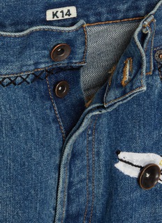 These hand-embroidered straight-leg jeans reimagine classic American workwear through a lens of artisanal storytelling. Crafted from medium-wash indigo denim, they are adorned with a whimsical tapestry of hand-stitched motifs. The contrast stitching at the waistband and pockets adds a rugged, handcrafted edge, while the straight-leg cut delivers a timeless, versatile silhouette. A definitive statement piece, they seamlessly blend functional denim heritage with playful, narrative-driven design.