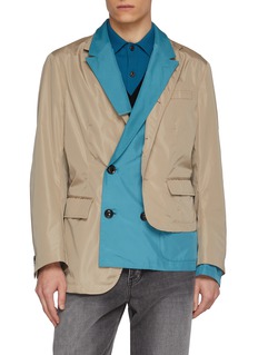 A study in contrast and precision, this nylon blazer reimagines tailoring through Kolor’s signature lens. Asymmetric paneling and unexpected colour layering disrupt classic lines, creating a sharp yet fluid silhouette suited to elevated everyday dressing or creative work settings.