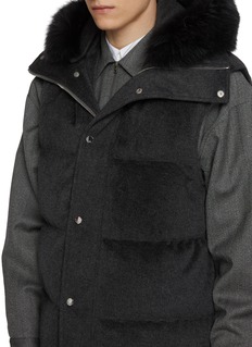 Elevating outerwear with refined texture, this down vest by KRUF fuses modern utility with luxurious tactility. Crafted from a wool-cashmere blend, it features a detachable fox fur-trimmed hood for versatile styling. Ideal for layering across city winters or alpine escapes.