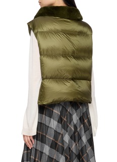 Crafted with a luxurious combination of glossy olive satin and sumptuous fur, this KRUF vest is a standout piece for the colder seasons. The large fur collar not only adds a touch of glamour but also provides extra warmth, making it as practical as it is stylish. Perfect for layering over a long sleeve tee or a lightweight sweater, this vest is sure to elevate any autumn or winter ensemble.