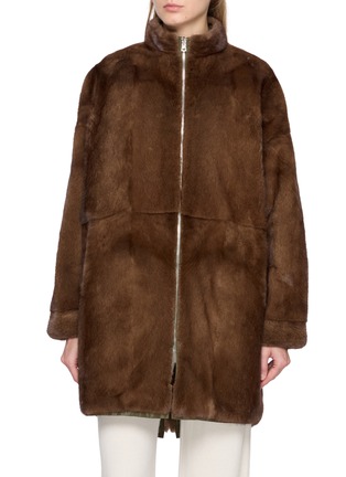 A study in quiet opulence, this reversible long coat shifts from velvety mink to a utilitarian nylon shell, embodying KRUF’s duality of indulgence and function. Its streamlined silhouette and high collar make it a sophisticated layer for winter tailoring or elevated casualwear.