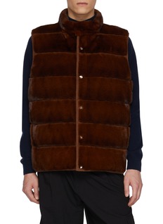 A study in tactile luxury, this mink and cashmere down vest by KRUF elevates cold-weather layering with sculptural precision. The plush horizontal panels and clean stand collar frame the silhouette with quiet authority—ideal over fine knits for winter city dressing or alpine escapes.