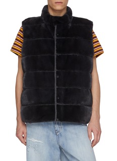 KRUF reimagines winter layering through contrast and control. This mink and cashmere down vest pairs velvety fur panels with a refined wool-blend back, creating depth in texture while retaining a streamlined profile. Layer it over striped tees or tailored knits for an effortless metropolitan edge.