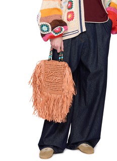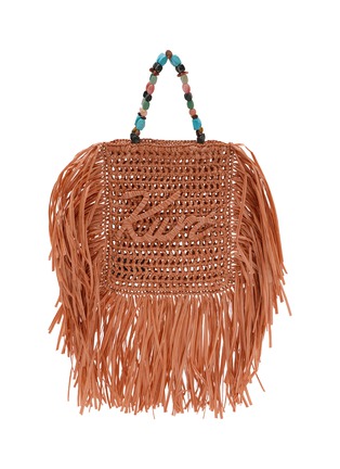 Kurt Geiger 以手工感重构夏日配饰,这款迷你 Kurt 包选用拉菲草编织而成,通透的网格肌理如镂空蕾丝,大面积流苏在行走间摇曳生姿,珍珠与紫晶串珠手柄则注入复古奢雅,成为造型中的点睛之笔。