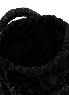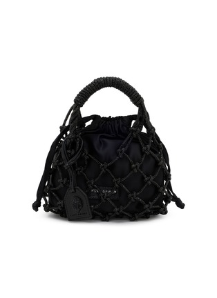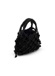 This artisanal drawstring bag features intricate macramé netting over a gathered pouch silhouette with sculptural wrapped handles. The decorative rope framework creates dimensional texture, while the iconic emblem charm adds signature finishing. A statement accessory that merges bohemian craftsmanship with contemporary edge for effortless sophistication.