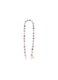 This exquisite LA COQUE FRANCAISE phone strap features a delicate chain adorned with charming purple flower accents. The soft lavender and deeper purple tones provide a beautiful contrast against the warm gold links, creating a feminine and romantic aesthetic. Complete with a signature charm and a practical clasp, this necklace is a perfect blend of elegance and whimsy.