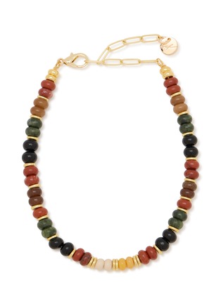 This exquisite La Coque Française necklace showcases a delightful array of multicolored beads, creating a piece that is as versatile as it is beautiful. The alternating sequence of rich reds, earthy browns, deep greens, and striking blacks, accented with golden highlights, offers a vibrant yet sophisticated palette. This piece is completed with a chic gold-toned clasp and an elegant chain, ensuring it sits perfectly at the collarbone.