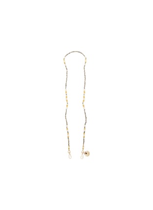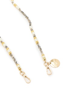 This LA COQUE FRANCAISE phone strap beautifully combines rustic charm with elegant sophistication. It features a delicate arrangement of interspersed gold and ivory accents along a slender chain adorned with natural-toned beads. The piece is further enhanced by a signature charm and a secure clasp, adding a touch of luxury and ease of wear.