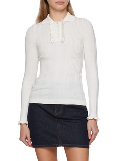 The Heath top by LA FETICHE reinterprets classic polo styling with a romantic twist. Finely ribbed in a cotton-wool blend, it features delicate frill trims and a removable tie at the collar. Pair with high-waisted tailoring for polished elegance, or denim for off-duty charm.