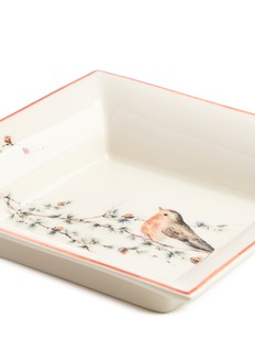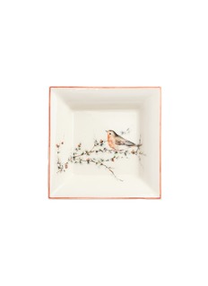 This videpoche plate showcases a charming robin perched on a branch adorned with berries and leaves. The delicate details and soft coral-red border bring a touch of nature-inspired elegance to your space. Ideal for holding small treasures, it adds a whimsical yet refined accent to any room.