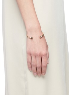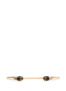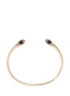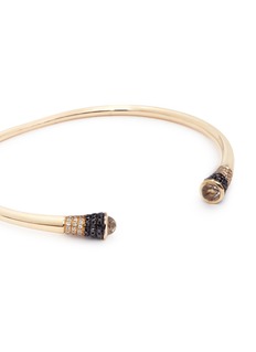 约旦设计师Lama Hourani融汇阿拉伯文化背景、旅游见闻及多元艺术,选用珍贵金属与宝石,创作出独一无二又意义隽永的珠宝首饰系列。这款开口式设计的手镯以18k黄金打造,开口处环镶了黑色和透明钻石,衬托着端部的褐色发晶托帕石,呈现出内部自然的丝状纹理,仿佛开启一场梦幻而浪漫的对话。