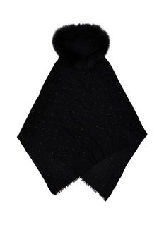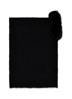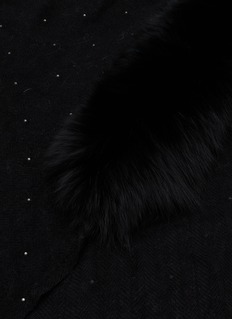 A study in texture and elegance, Lane’s lace shawl is finely woven from merino wool and cashmere for a weightless drape. Adorned with tonal beaded accents and framed by a voluminous fox fur collar, it lends a modern opulence—ideal for evening layering or winter soirées.